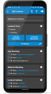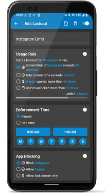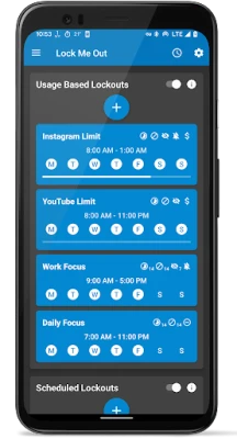 Usage based lockouts have rules that trigger automatic lockouts based on your device usage. You can set up usage rules based on time spent in chosen apps, total screen time, the number of times apps are opened, or the number of device unlocks. Usage rules are scheduled to be enforced at the chosen times.