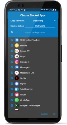 There are three app blocking modes. The first mode blocks the chosen apps and allows the rest. The second mode allows the chosen apps and blocks the rest. The third and strictest mode only allows use of the lock-screen. You can still answer calls or call emergency numbers in this mode.